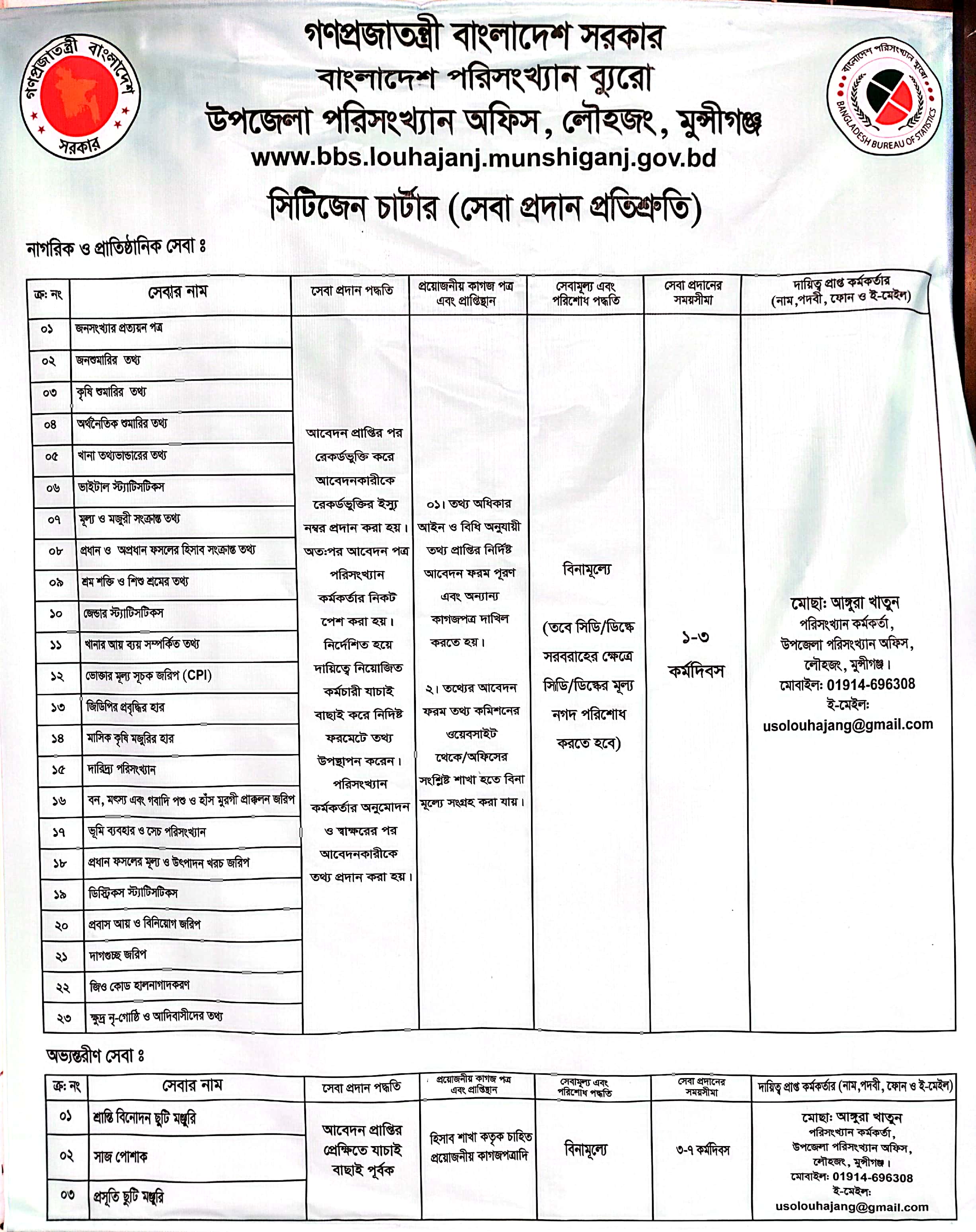 আমাদের লক্ষ্যঃ জাতীয় পরিসংখ্যান প্রতিষ্ঠান হিসাবে স্থানীয় ও আন্তর্জাতিকভাবে রতিষ্ঠা লাভ। আমাদের উদ্দেশ্যঃসঠিক, মানসম্মত এবং সময়ানুগ পরিসংখ্যান সরবরাহ, নীতি নির্ধারক, পরিকল্পনাবিদ,গবেষক, সিদ্ধান্ত গ্রহনকারী ও জনসাধারণের প্রয়োজনীয় তথ্য/ উপাত্ত পরিবেশন। আমাদের সেবা ও প্রকাশনাঃপ্রতি দশ বৎসর অন্তর ( ১) আদম শুমারী (২) কৃষি শুমারী (৩)অর্থনৈতিক শুমারী পরিচালনা ও সদর দপ্তর কর্তৃক প্রতিবেদন প্রকাশ। এছাড়া সর্বপ্রকার জরিপ, নমুনা জরিপ এর তথ্য/ উপাত্ত সম্বলিত ন্যাশনাল ভলিউম, জেলা ও কমিউনিটি সিরিজ, পকেট বুক ও বুলেটিন আকারে প্রায় ১৯ ধরণের প্রকাশনা রয়েছে। সেগুলো থেকে জনগন প্রত্যক্ষ ও পরোক্ষ ভাবে সেবা গ্রহন করে থাকে। উপজেলা পর্যায়ের অফিসে ও উক্ত প্রকাশনা সমুহ উপকার ভোগীদের জন্য ব্যবহারের সুযোগ দেয়া হয়। আমাদের সেবা গ্রহণকারীঃ (1) সরকারী/ বেসরকারী সংস্থা। (2) উন্নয়ন সহযোগী ও দাতা সংস্থা। (3) নীতি নির্ধারক, পরিকল্পনাবিদ ও গবেষক। (4) জনসাধারণ ও শিক্ষক-শিক্ষার্থী।